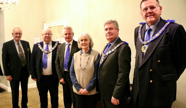 Left to Right: W.Bro Alan Bovingdon-Cox (Bertie Lodge), R.W Brother James Hilditch (Provincial Grand Master), W.Bro James Cairns (Bertie Lodge Charity Steward), Valerie Berry (UCARE), W.Bro Graham Ellis (Deputy Provincial Grand Master) and W.Bro Alan Baverstock (Assistant Provincial Grand Master).